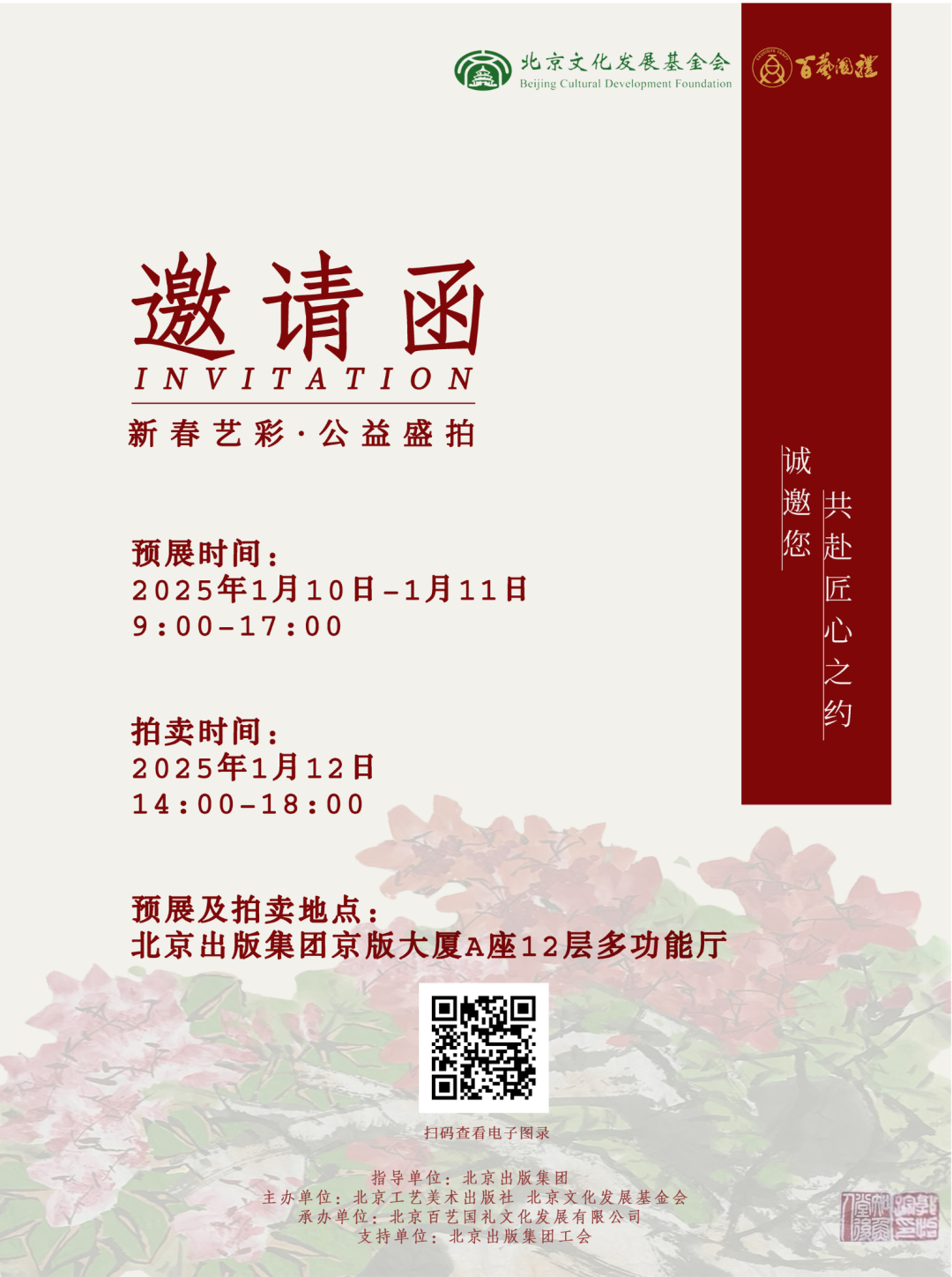2025年伊始,北京文化发展基金会联合北京工艺美术出版社开展“新春艺彩·公益盛拍”公益拍卖活动,诚邀社会各界爱心人士的参与! (扫描二维码查看本次活动拍品)