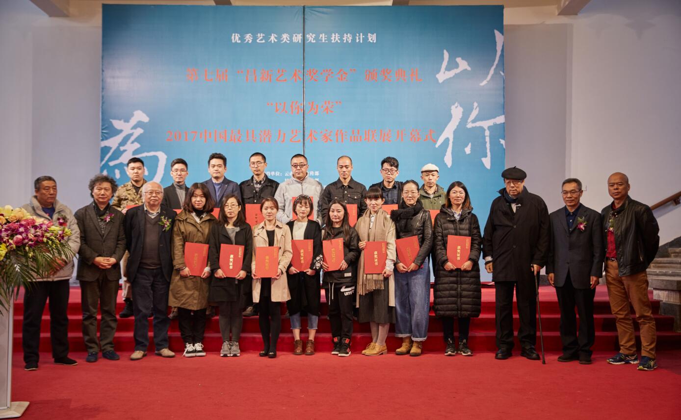 11月22日下午,“以你为荣”2017中国最具潜力艺术家作品联展开幕式在云南美术馆隆重举行,第七届“昌新艺术奖学金”暨2017年度“最具潜力艺术家”也同时揭晓。此次展览不仅展出本届获奖学生的优秀作品,同时特别展出周昌新先生的重彩油画作品,还邀请了前六届的获奖艺术家展出他们最新的艺术作品。云南省委常委、宣传部部长赵金,昆明市委常委、宣传部部长金幼和,云南省文化厅党组书记、厅长李涛,云南大学副校长周学斌,清华大学美术学院教授、著名画家、云南大学昌新国际艺术学院名誉院长杜大恺,中国美协理论委员会副主任、《美术》杂志社社长兼主编、云南大学昌新国际艺术学院副院长尚辉,中央美术学院教授、云南大学昌新国际艺术学院常务副院长杨建华,著名书画鉴定家陈岩,云南美术家协会主席、云南美术馆馆长罗江,周昌新艺术基金名誉理事长、云南大学昌新国际艺术学院院长周昌新等出席了此次活动。中国美协理论委员会副主任、《美术》杂志社社长、云南大学昌新国际艺术学院副院长尚辉,云南大学副校长周学斌,云南美术家协会主席、云南美术馆馆长罗江, 云南大学昌新国际艺术学院院长周昌新在开幕式上分别致辞, 历届获奖研究生代表赵苑杉及2017年金奖获得者中国艺术研究院李琳作了发言。展览持续至11月30日。